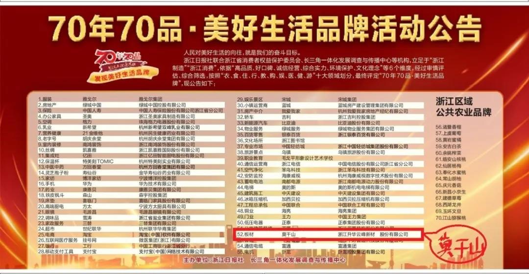 3月5日,浙江日?qǐng)?bào)社聯(lián)合浙江省消費(fèi)者權(quán)益保護(hù)委員會(huì)、長三角一體化發(fā)展調(diào)查與傳播中心等機(jī)構(gòu)開展的“70年70品·發(fā)現(xiàn)美好生活品牌”評(píng)選揭曉,升華集團(tuán)所屬企業(yè)升華云峰“莫干山板材”榮列其中,成為板材類中唯一入選品牌。