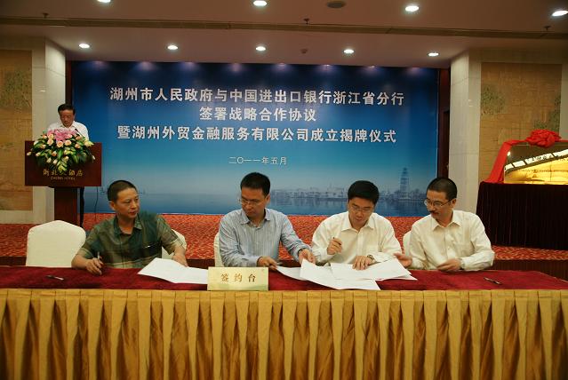 5月9日,湖州市與中國進(jìn)出口銀行浙江省分行戰(zhàn)略合作協(xié)議暨湖州外貿(mào)金融服務(wù)有限公司掛牌儀式在湖州舉行。中國進(jìn)出口銀行浙江省分行行長陳筱敏,湖州市副市長李建平為湖州外貿(mào)金融服務(wù)有限公司的成立揭牌。市政府秘書長徐克強(qiáng)主持會(huì)議,市外經(jīng)貿(mào)局熊全龍局長介紹了湖州金融服務(wù)有限公司籌備情況。集團(tuán)公司董事長夏士林、總經(jīng)理吳夢根、副總經(jīng)理兼湖州外貿(mào)金融服務(wù)有限公司董事長張建國等出席儀式。